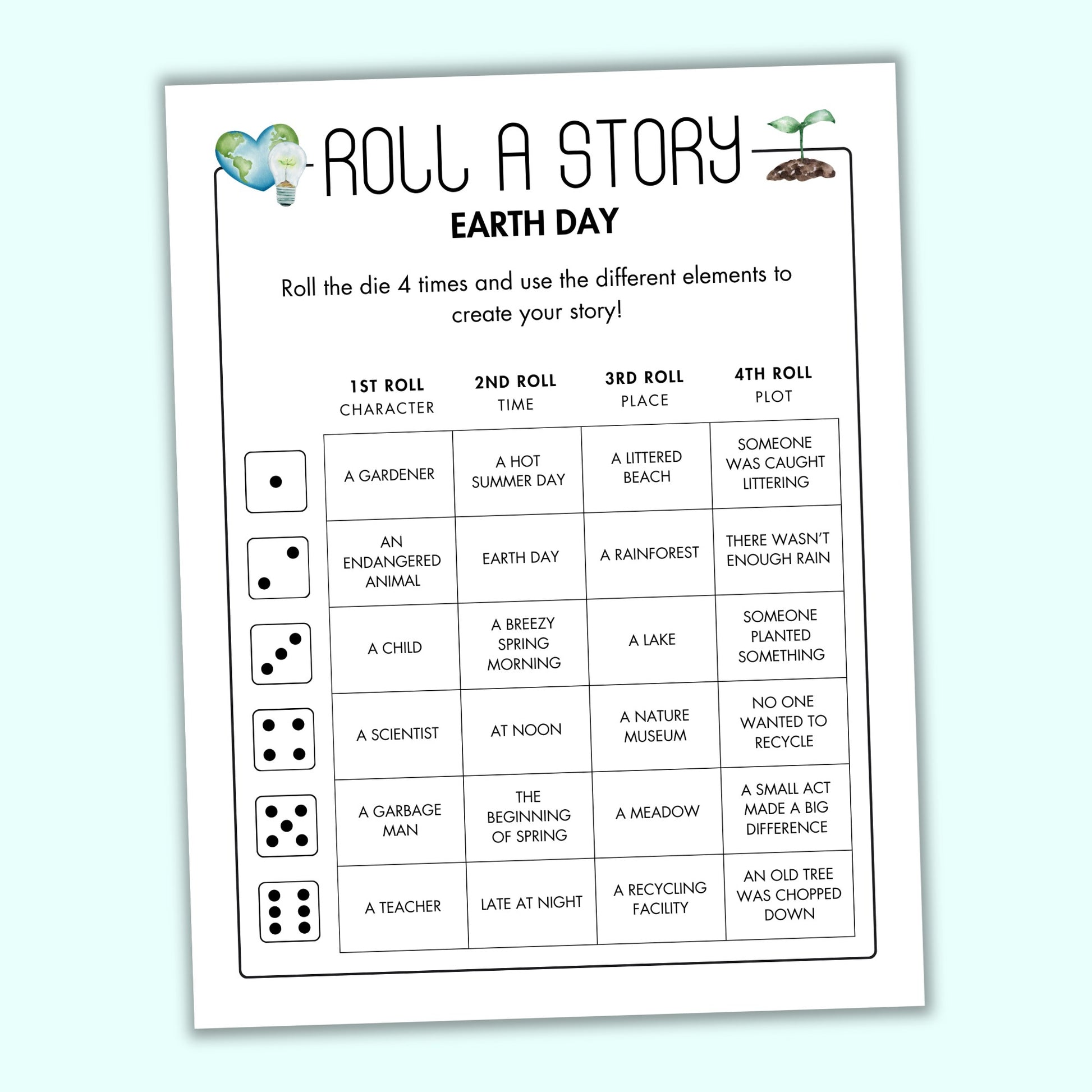 This Earth Day writing prompt game would make a great classroom activity or party game! All you'll need to create your story is a die, some paper and something to write with.
