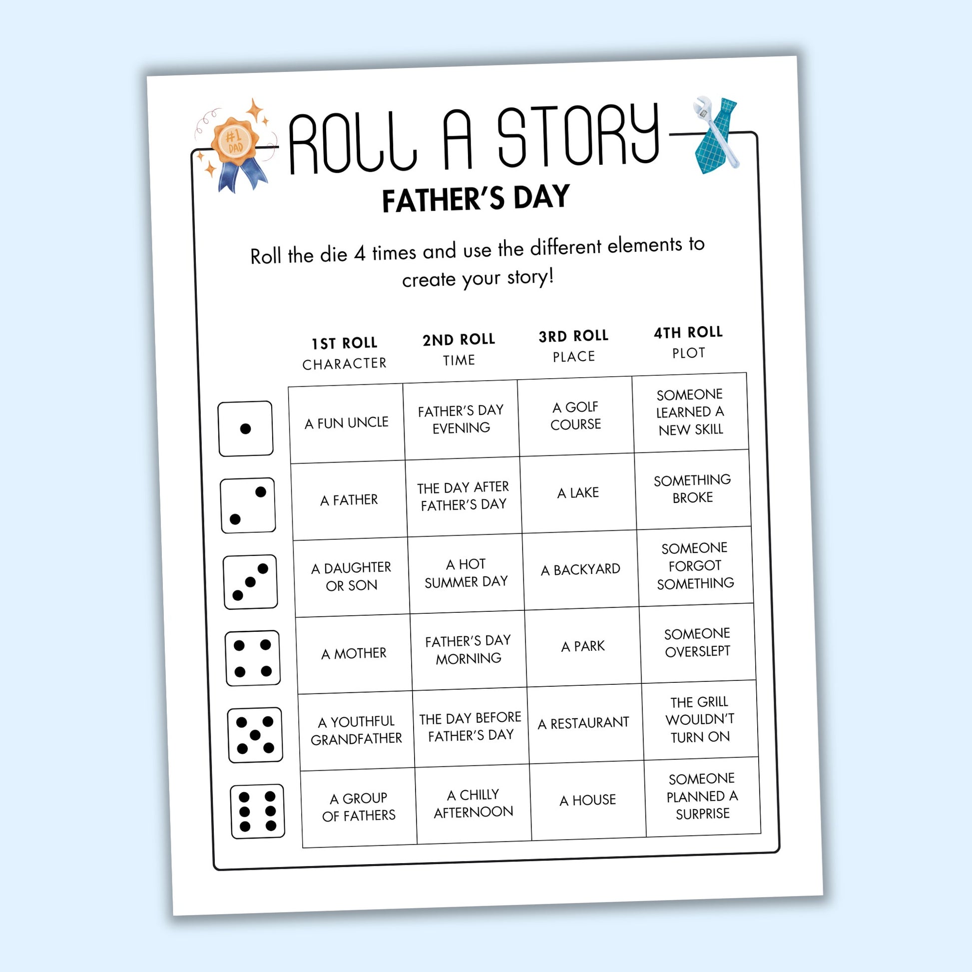 This Father's Day writing prompt game would make a great classroom activity or party game! All you'll need to create your story is a die, some paper and something to write with.