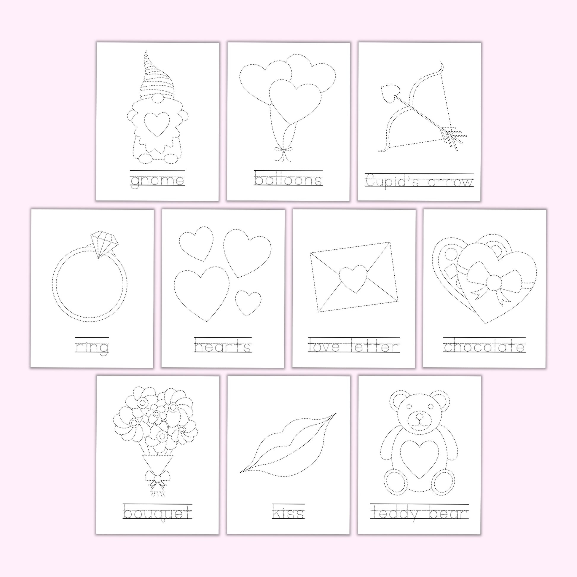 • 10 Valentine-themed tracing worksheets