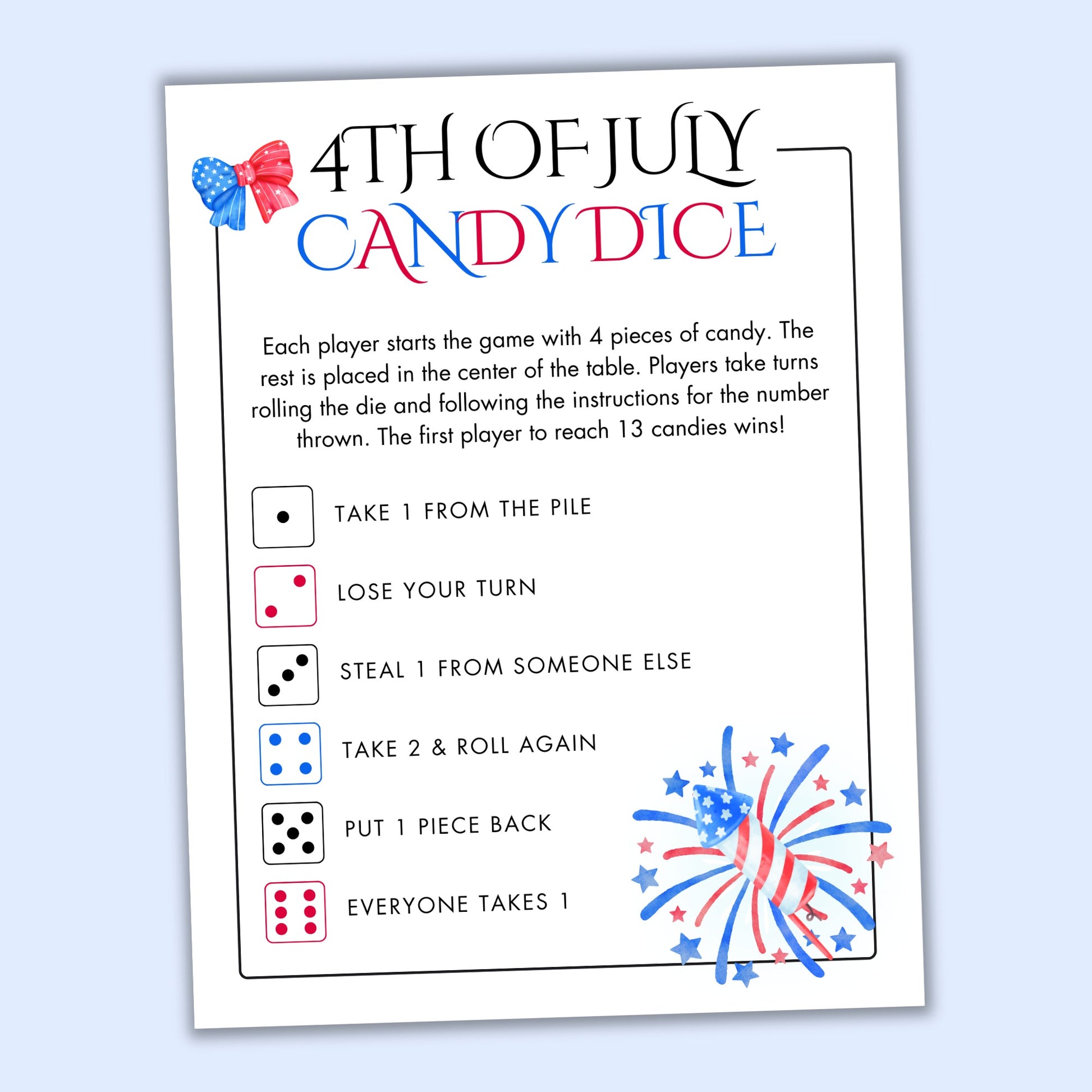 - 1 Independence Day candy dice activity