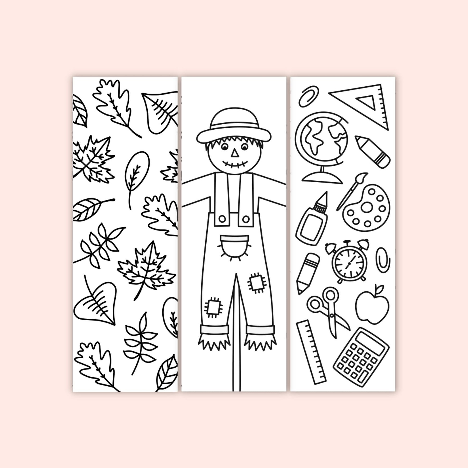 - 6 fall-themed coloring bookmarks