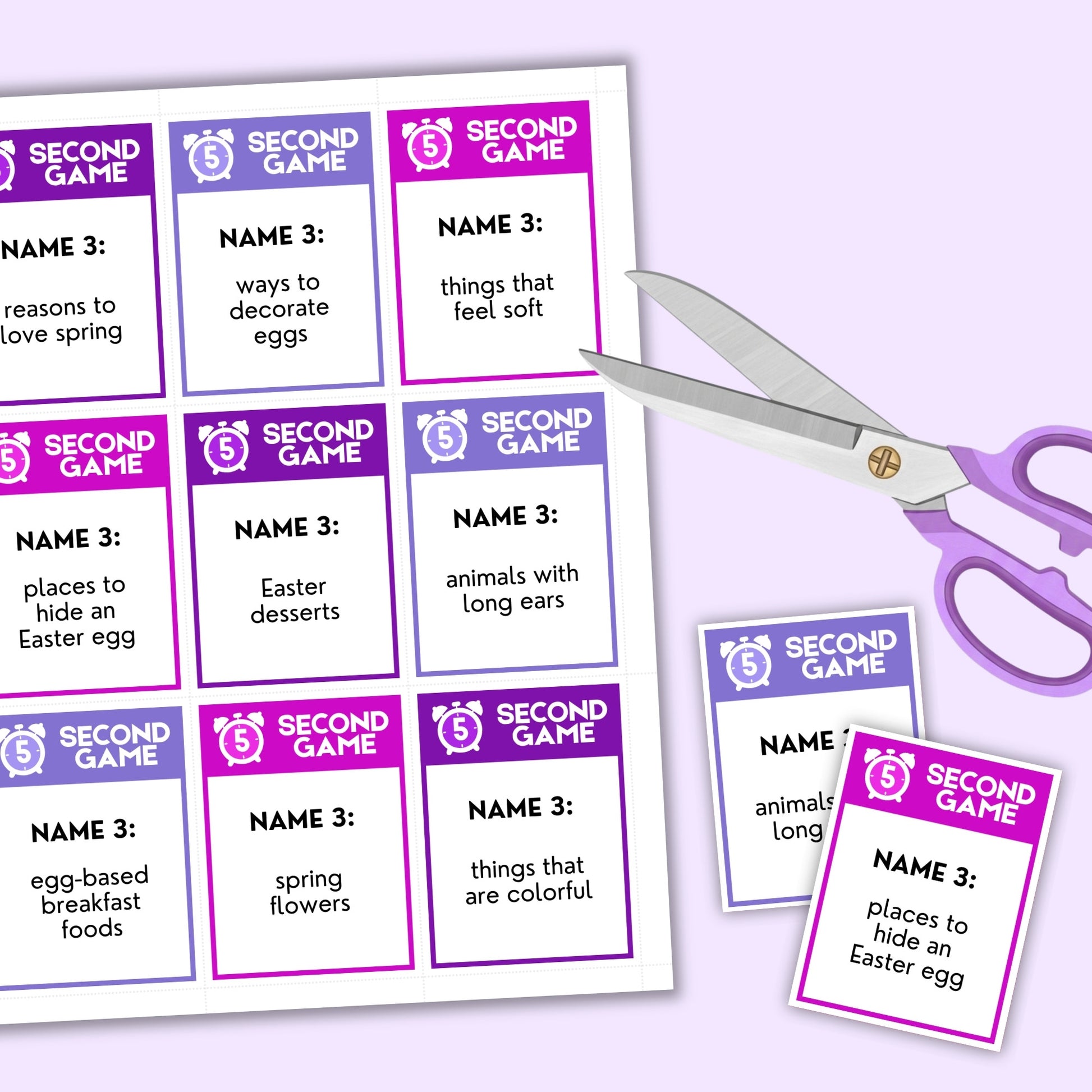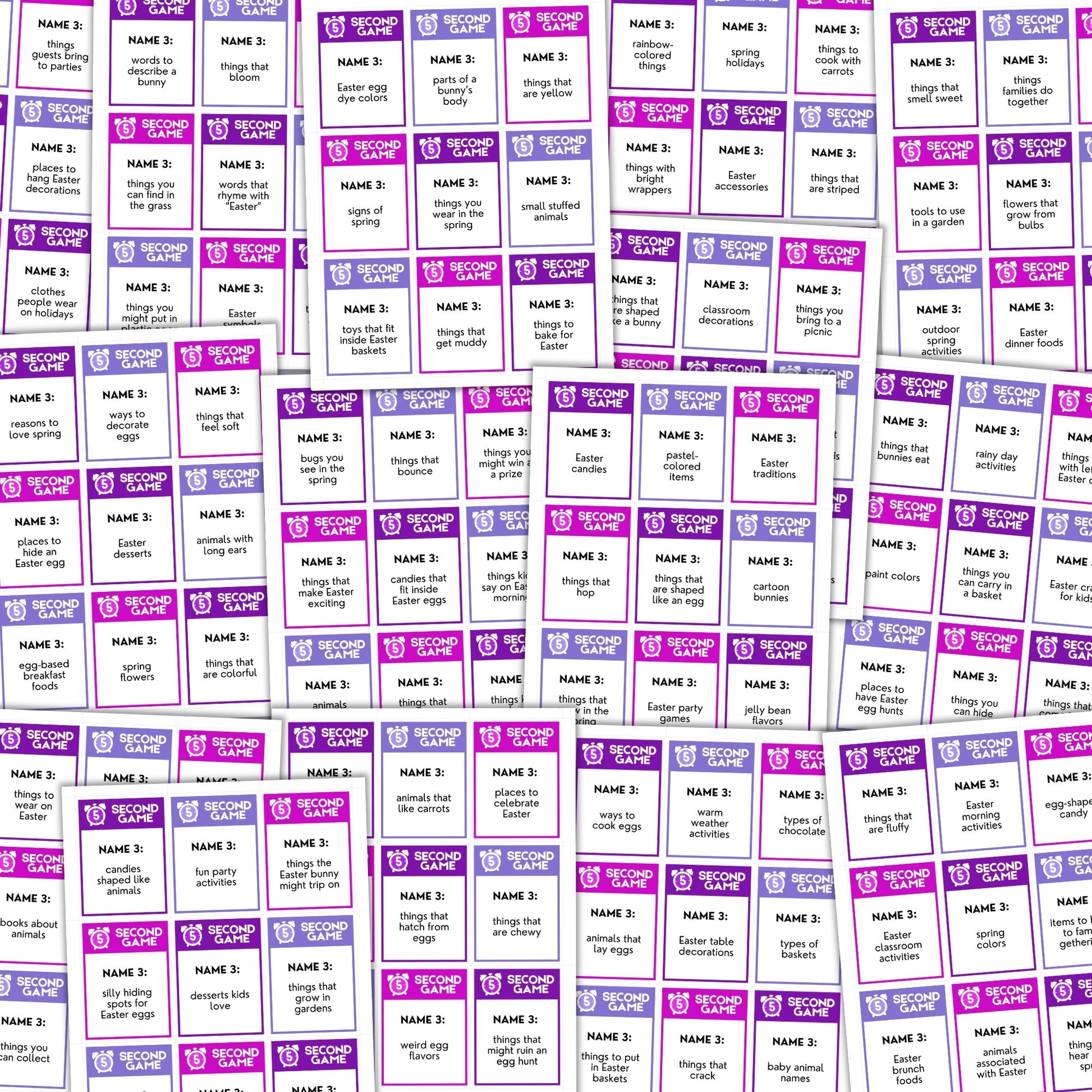 This Easter 5-second game would make a great addition to your next family or classroom party! Read the card, set a timer and try to give 3 answers that are related to your prompt… in 5 seconds or less.