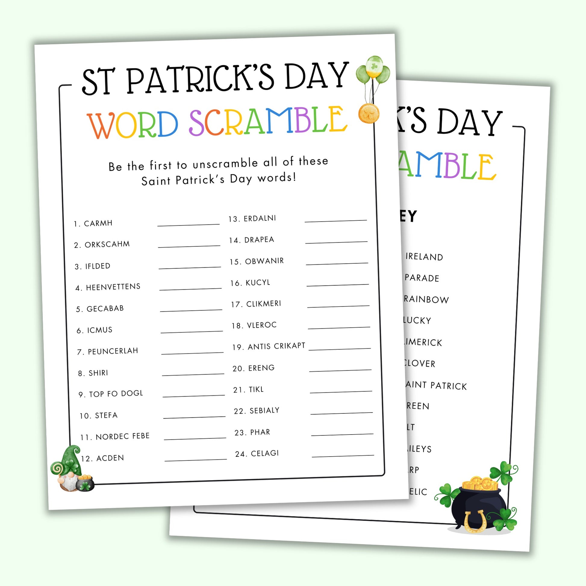 This printable St Patrick's Day word scramble would make a great last-minute activity for classrooms, office parties or get-togethers. Print out a sheet for each player (or team of players) and try to unscramble all the St Patty's-themed words before the other players. First one to unscramble all of the words wins!