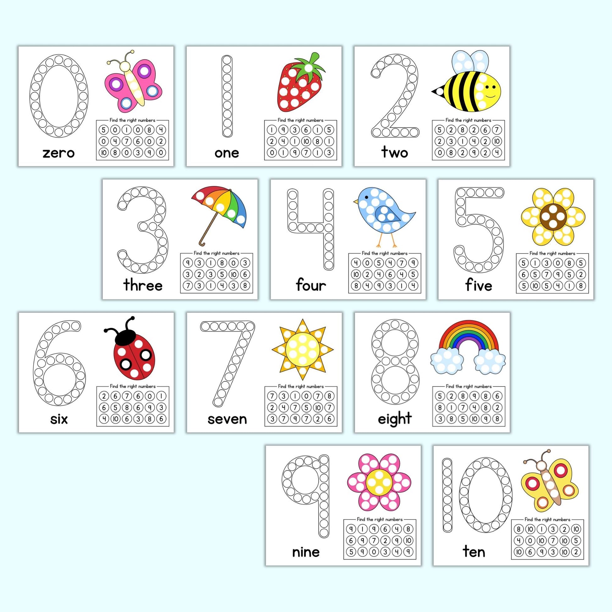 Simply print the pages at home and let your child color each number, identify the correct symbols and fill in each image using do-a-dot markers!